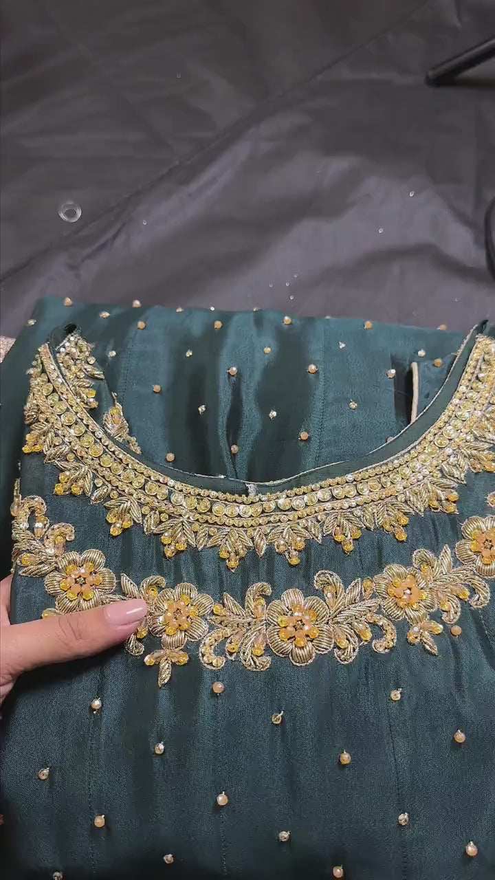The Anisha Maxi is a statement of unyielding luxury, presented in a commanding Deep Emerald Green—a color synonymous with regal power and traditional elegance, perfect for high-profile Party wear. The Maxi silhouette is crafted entirely from premium Silk, ensuring a rich texture and exquisite, fluid drape that is both sculptural and effortlessly graceful. The dense hand-embellishment provides a breathtaking contrast against the deep hue, making the wearer the undeniable focal point. This is heirloom-quality Pakistani formal wear, sourced factory-direct from the Mochi Gate ateliers, securing you access to elite, authentic quality while bypassing the designer markup entirely.