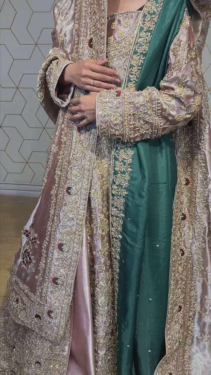 The Zimal Zehra is a masterclass in regal color theory, designed for the bride who understands the power of contrast. The base silhouette is a luminescent Dusty Rose Gold (Champagne) Maxi, rendered in sheer French Net to allow the heavy Zardozi work to ""float"" on the body. The narrative twist comes in the form of a rich Emerald Green Silk Shawl, which grounds the ethereal gold with a strike of heritage luxury. It is the definitive look for a grand Walima or a royal-themed Nikkah.
